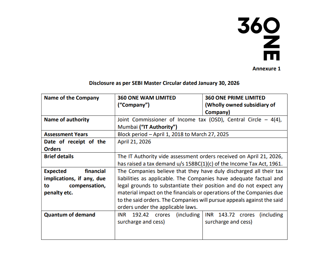 360 One Wam disclosed income tax assessment orders involving a combined ₹335.66 crore tax demand on the company and its wholly owned subsidiary. Management stated it has adequate legal grounds to contest the demand and intends to file appeals, while asserting no material impact on operations or financials is expected.
