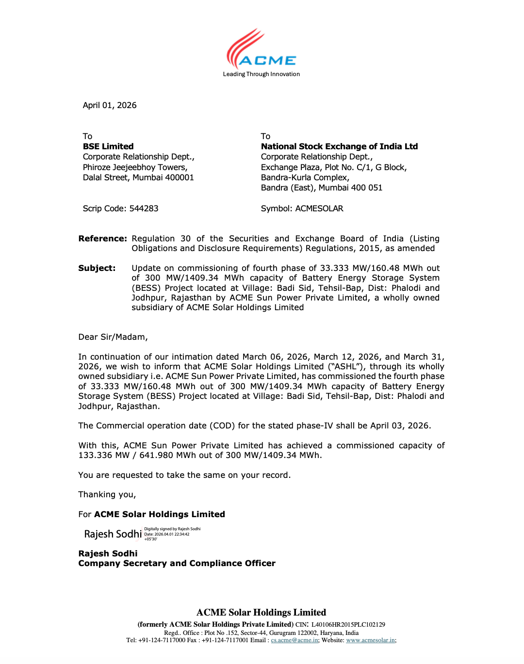 ACME Solar Holdings Limited announced that its wholly owned subsidiary, ACME Sun Power Private Limited, has successfully commissioned the fourth phase of its Battery Energy Storage System (BESS) project located in Rajasthan.