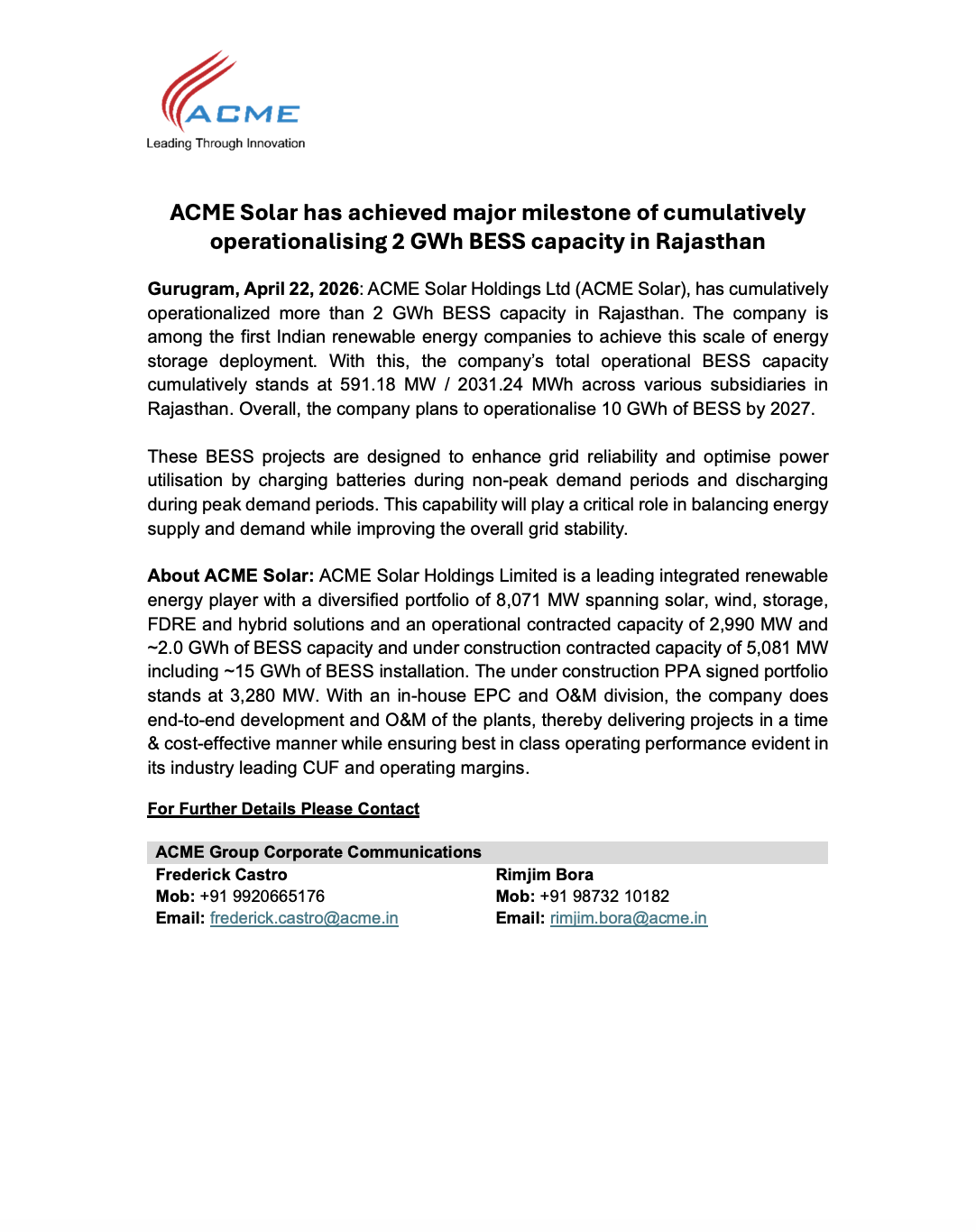 ACME Solar has operationalised over 2 GWh of Battery Energy Storage System (BESS) capacity in Rajasthan, marking a major execution milestone and strengthening its position in large-scale energy storage deployment.