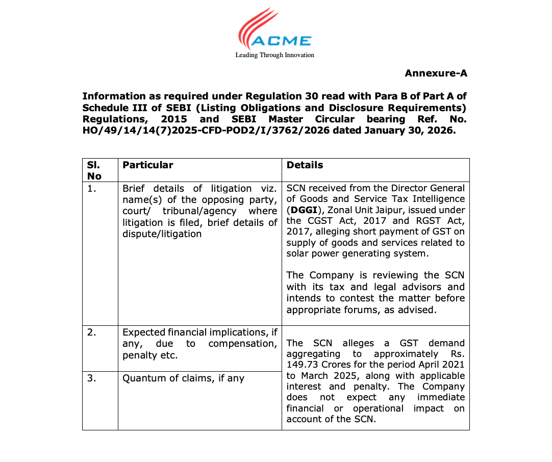 ACME Solar has received a Show Cause cum Demand Notice (SCN) from GST authorities alleging ₹149.73 crore tax shortfall related to solar project operations.