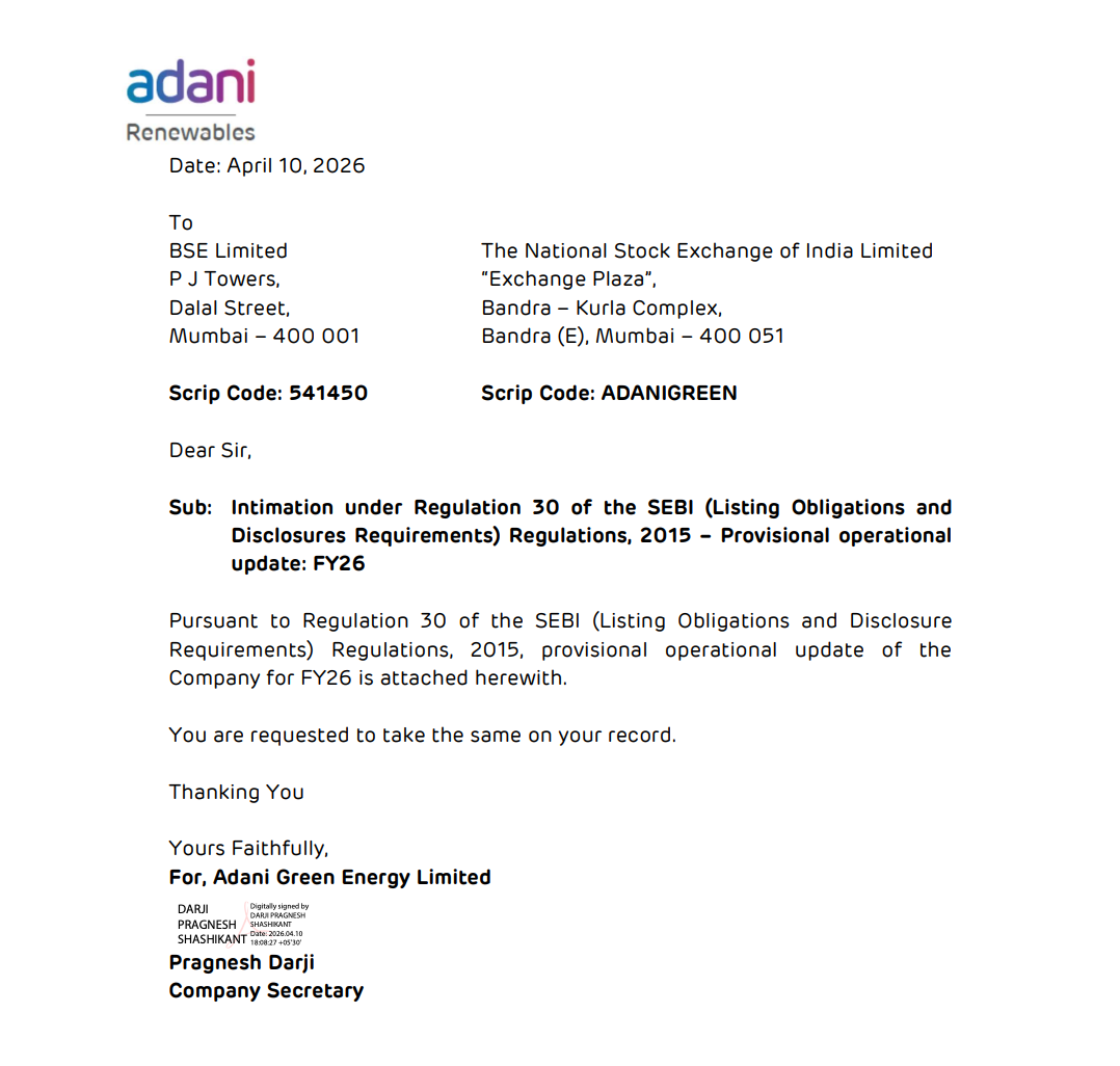 Adani Green Energy Limited released its provisional operational update for FY26, highlighting strong growth across capacity addition and energy generation.