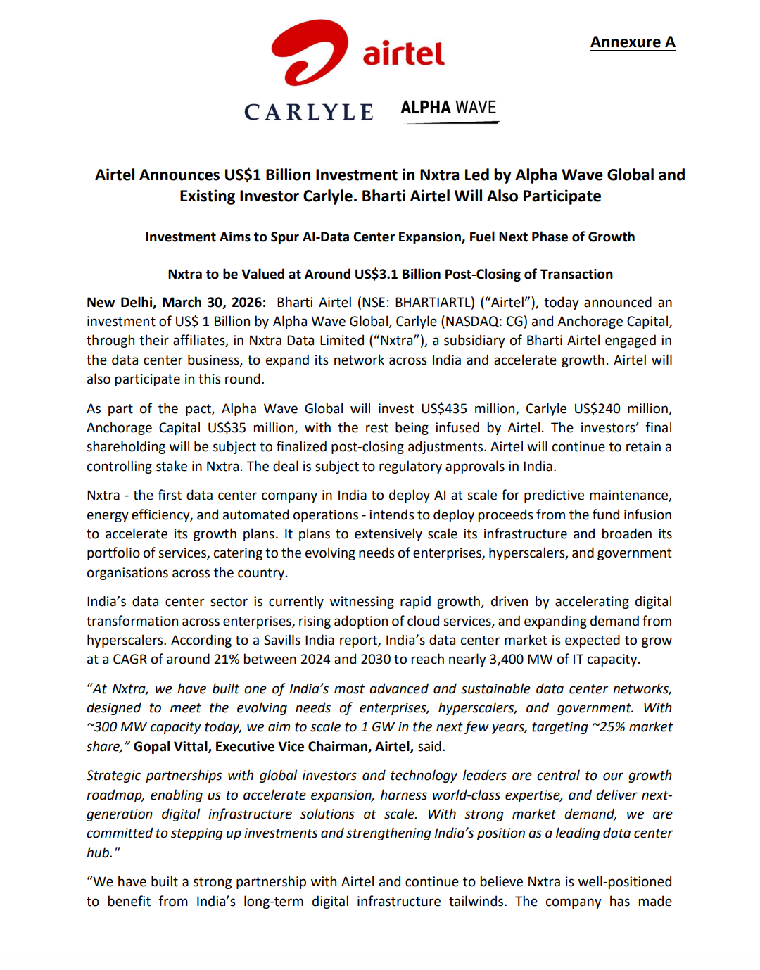 Bharti Airtel has announced a $1 billion investment in its data center subsidiary Nxtra, led by global investors Alpha Wave, Carlyle, and Anchorage Capital. The deal values Nxtra at around $3.1 billion, marking a major push into AI-driven data infrastructure.