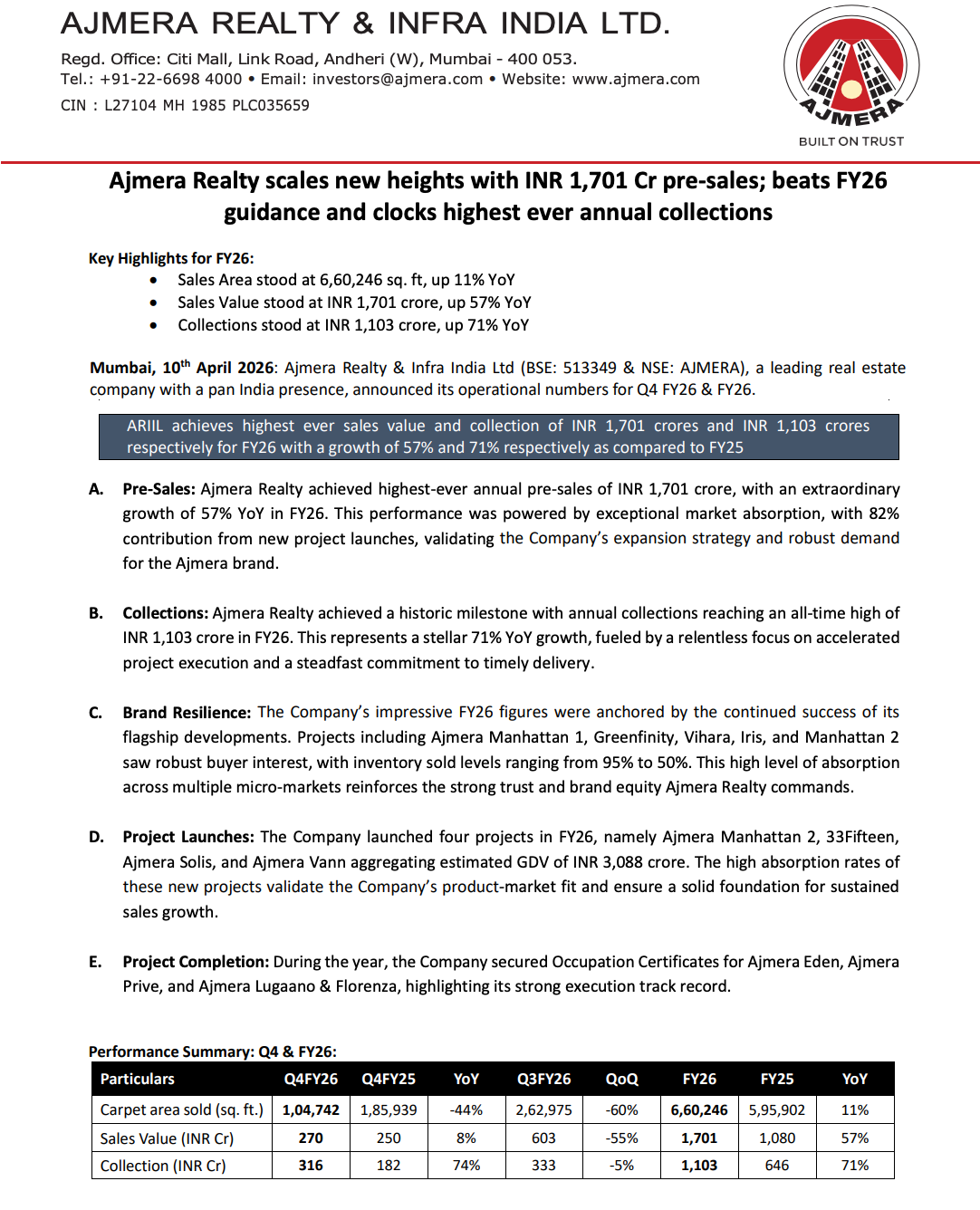 Ajmera Realty announced its operational update for Q4FY26 and FY26, reporting record-breaking performance across key metrics.