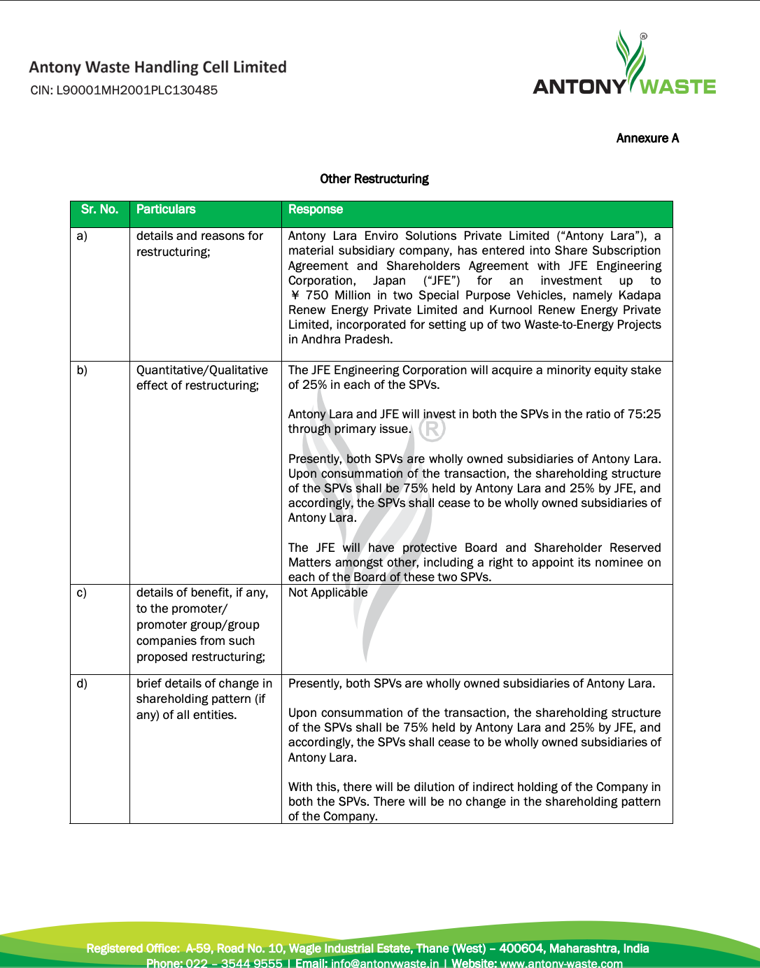 Antony Lara Enviro Solutions Private Limited, a material subsidiary of Antony Waste Handling Cell Limited, has entered into a Share Subscription Agreement and Shareholders’ Agreement with JFE Engineering Corporation (Japan).