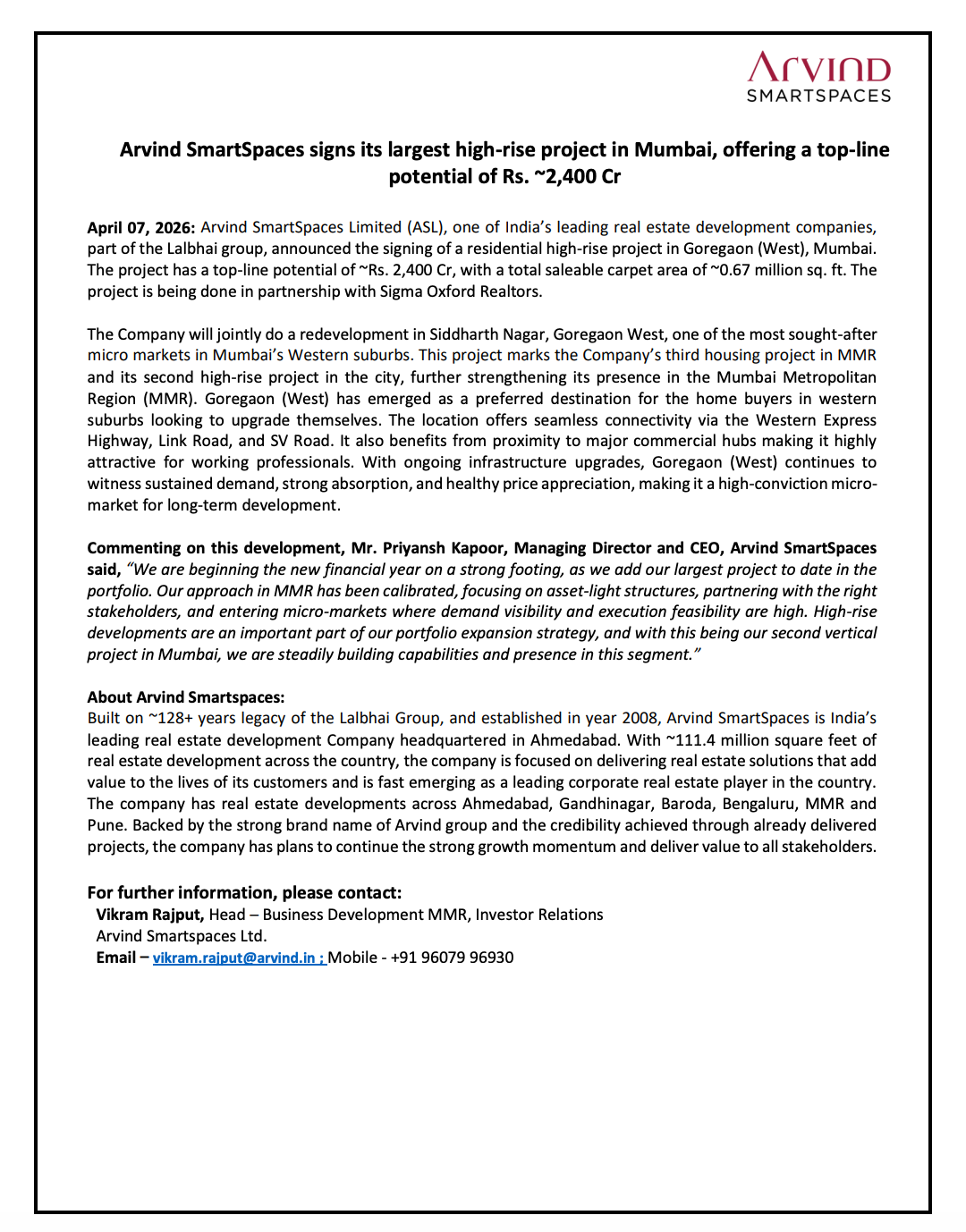 Arvind SmartSpaces has signed its largest high-rise residential project in Mumbai with a top-line potential of ~₹2,400 crore, alongside strategic stake acquisition and partial divestment in subsidiaries.