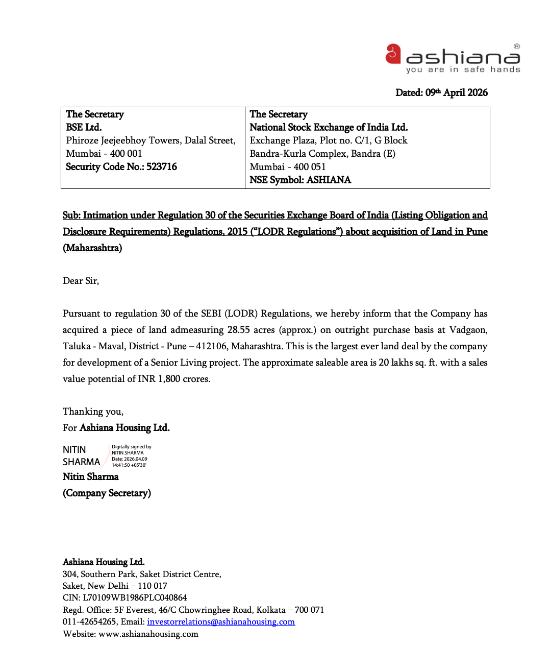 Ashiana Housing Limited has acquired land located at Vadgaon, Taluka Maval, District Pune for the purpose of Development of a Senior Living Residential project.