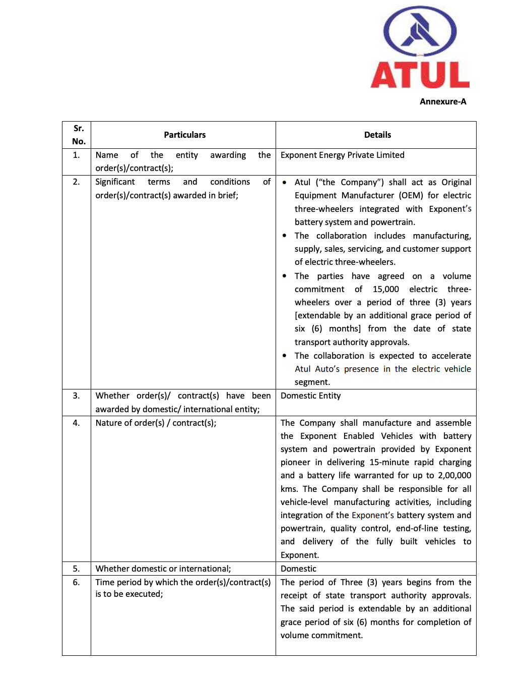 Atul Auto Limited has entered into a strategic MoU with Exponent Energy to manufacture and supply 15,000 electric three-wheelers over 3 years, integrating Exponent’s rapid-charging battery technology, with a total deal value of ~₹490 crore.