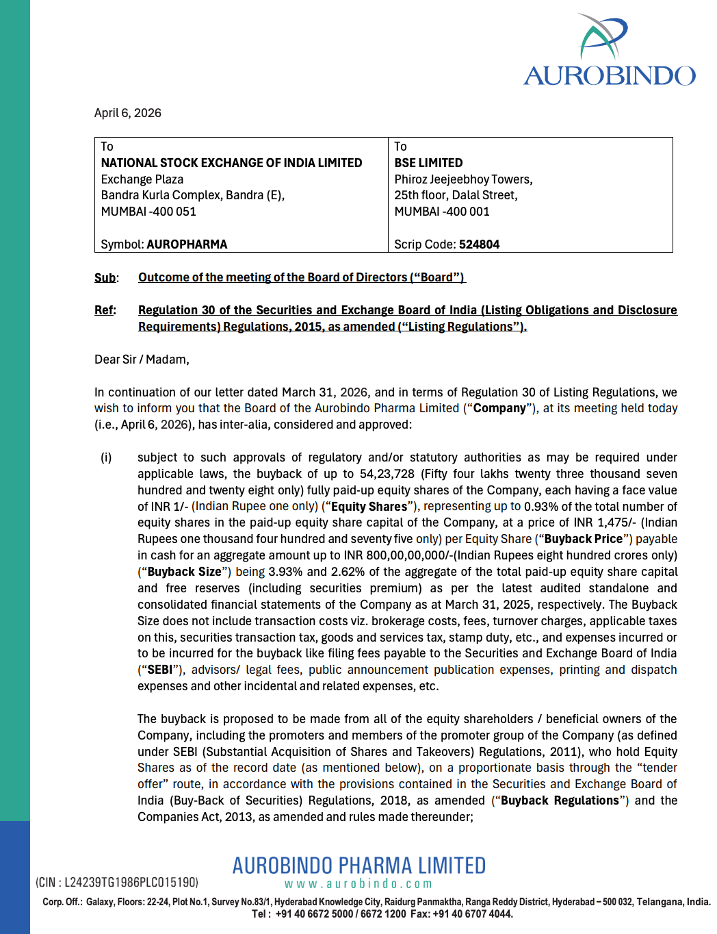 Aurobindo Pharma Limited announced that its Board has approved a share buyback of up to ₹800 crore through the tender offer route.