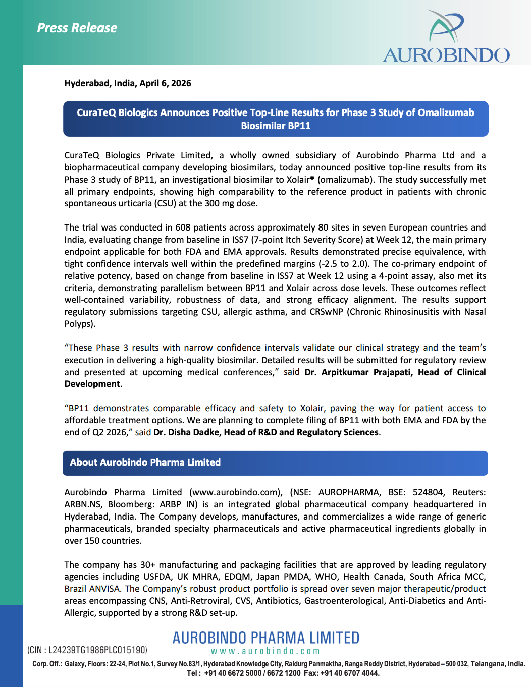 Aurobindo Pharma’s subsidiary CuraTeQ Biologics has announced positive top-line results from its Phase 3 clinical study of Omalizumab biosimilar BP11, demonstrating strong comparability and efficacy.