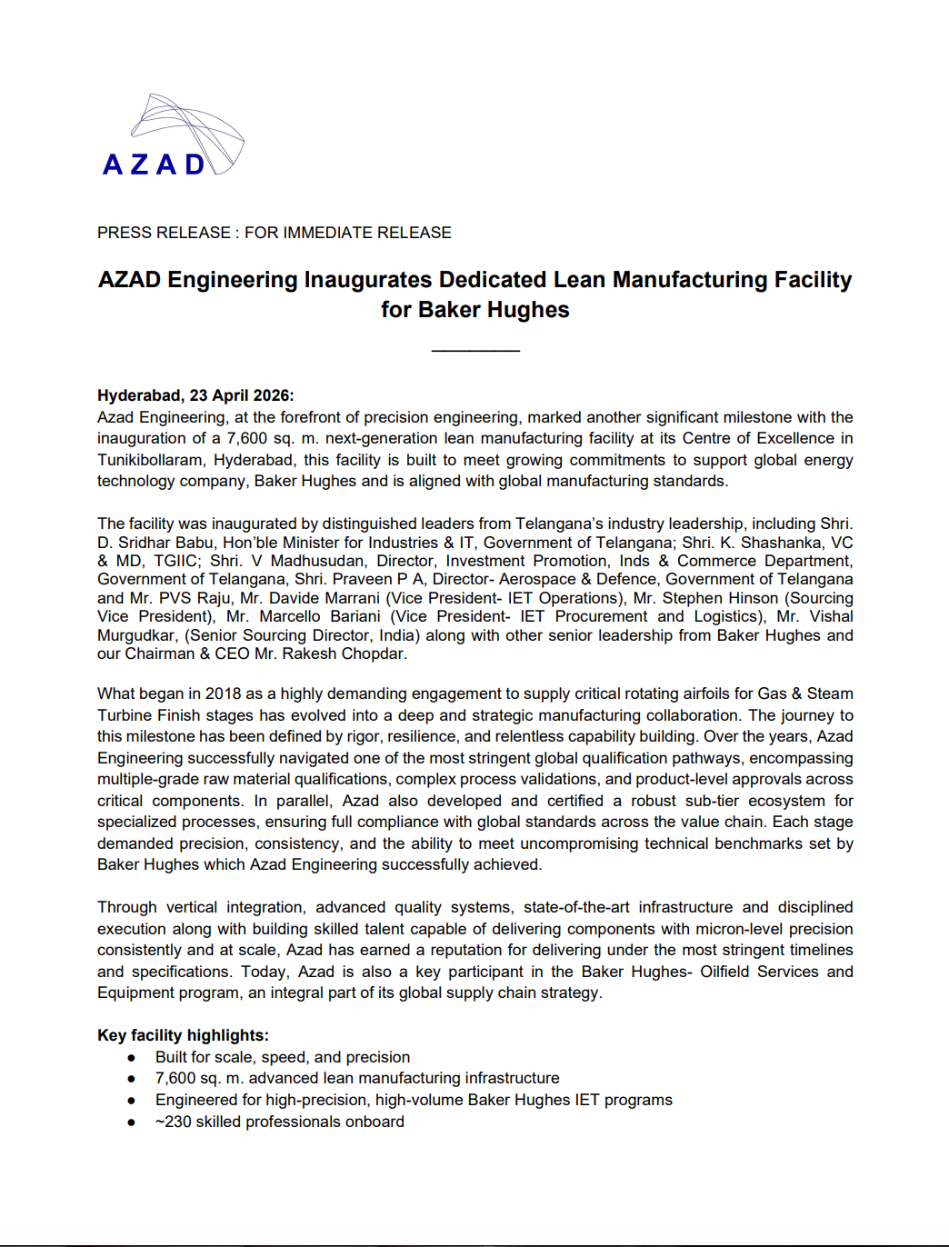Azad Engineering has inaugurated a dedicated 7,600 sq. m. lean manufacturing facility in Hyderabad for Baker Hughes, strengthening its position in high-precision global manufacturing and expanding capacity in energy and industrial segments.