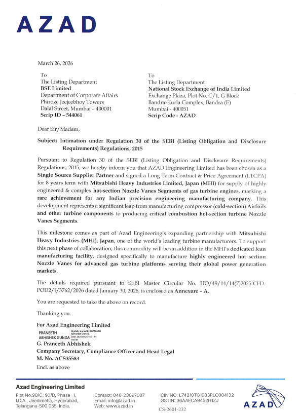 Azad Engineering has been selected as a Single Source Supplier Partner by Mitsubishi Heavy Industries (Japan) and has signed a Long-Term Contract & Price Agreement (LTCPA) for supplying advanced turbine components.