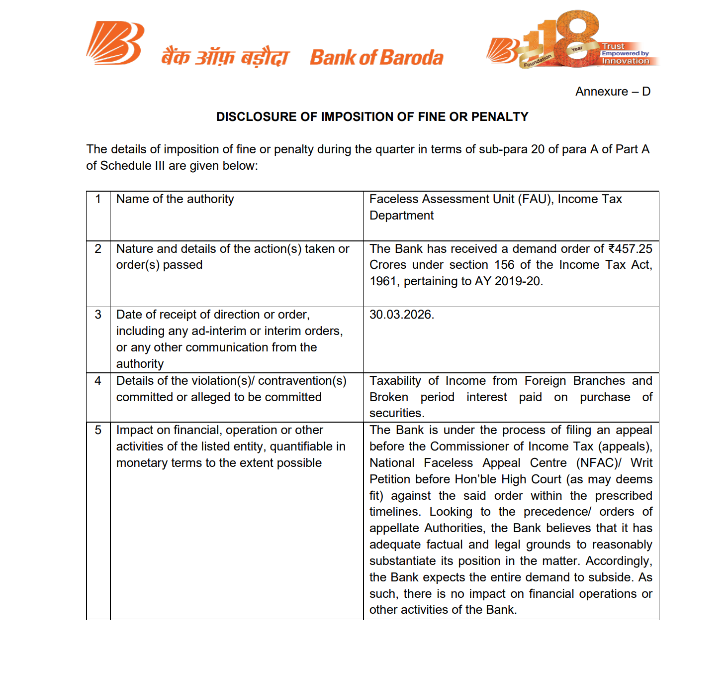 Bank of Baroda has received a tax demand order of ₹457.25 crore from the Income Tax Department (Faceless Assessment Unit) for AY 2019-20. The bank plans to challenge the order through legal channels and expects the demand to be resolved in its favor.