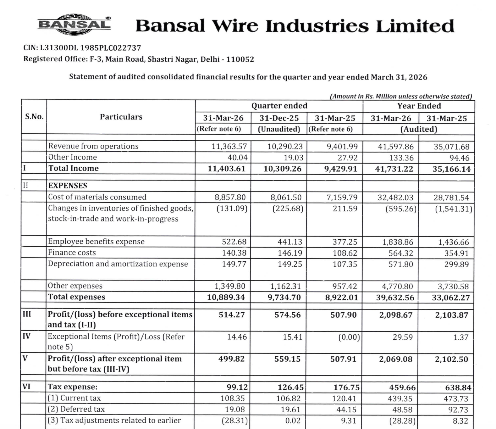 Bansal Wire Industries – Q4 FY26 Results