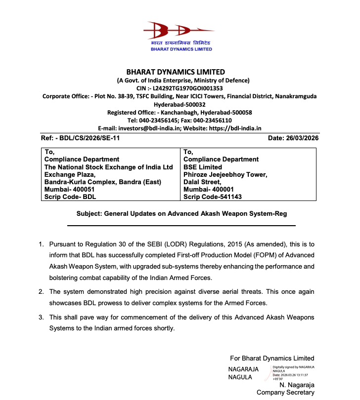 Bharat Dynamics announced the successful completion of the First-Off Production Model (FOPM) for the Advanced Akash Weapon System, incorporating upgraded sub-systems.