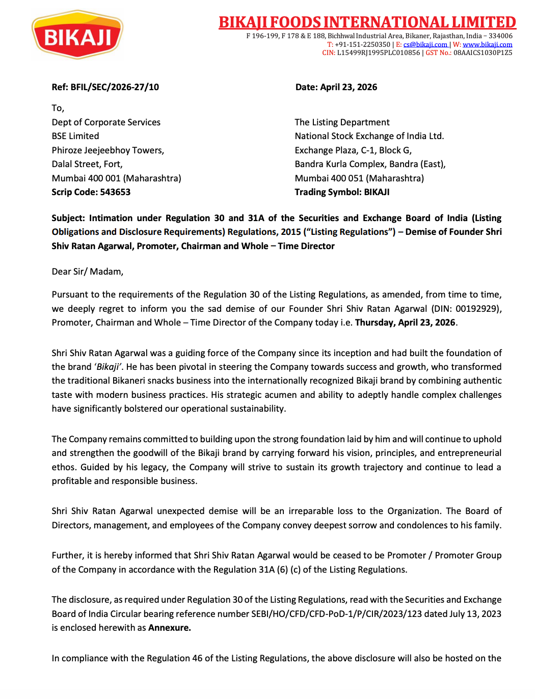 Bikaji Foods has informed that its Founder and Chairman, Shri Shiv Ratan Agarwal, has passed away on April 23, 2026. He was instrumental in building the company and transforming it into a nationally recognized brand.