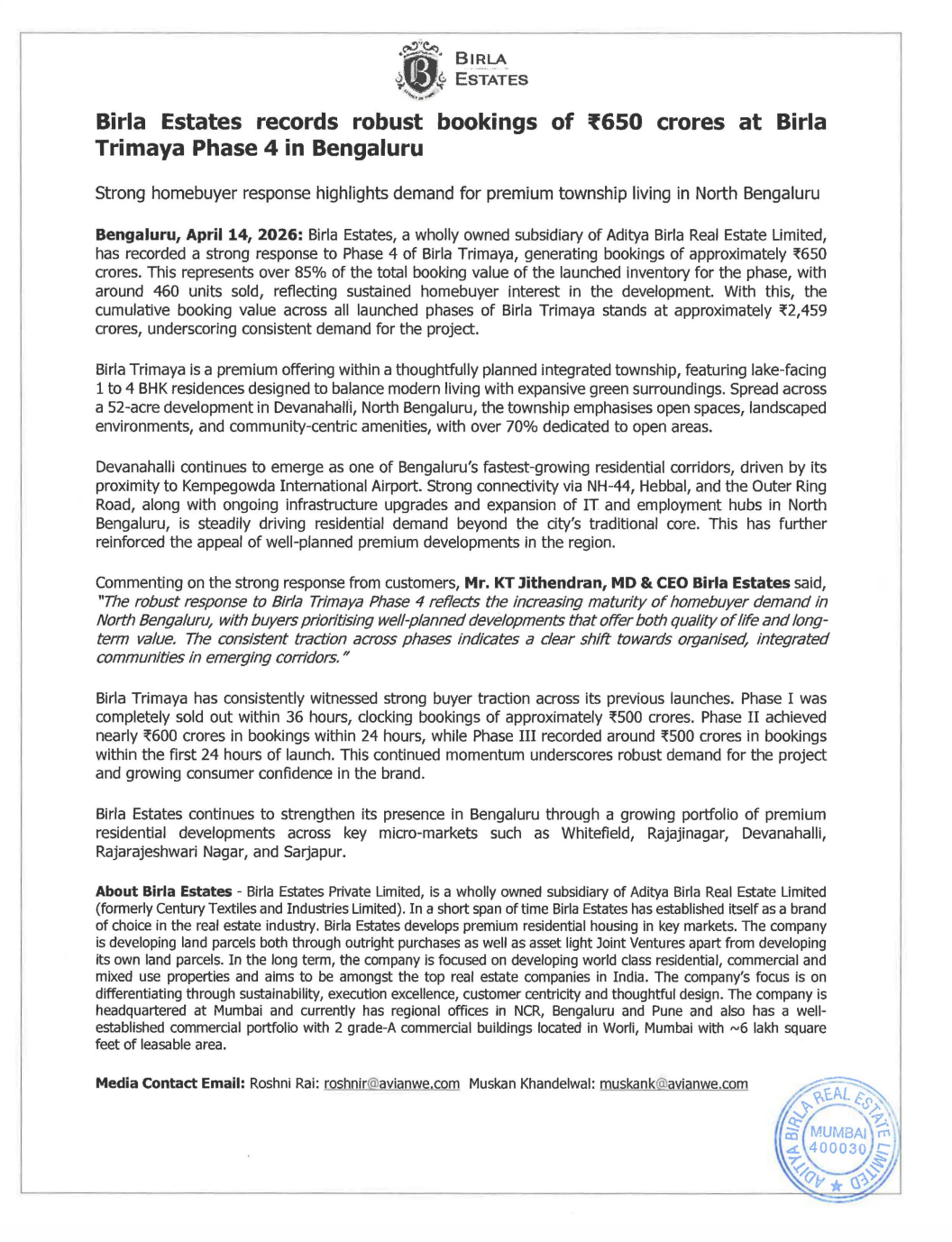 Birla Estates (a wholly owned subsidiary of Aditya Birla Real Estate Limited) has reported strong bookings of approximately ₹650 crore in Phase 4 of its Birla Trimaya project in Bengaluru, reflecting robust demand for premium township living