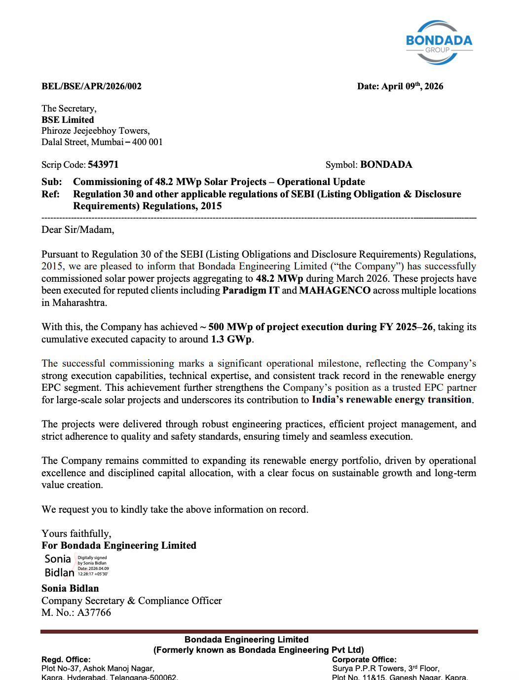 Official Exchange Filing: Bondada Engineering Limited