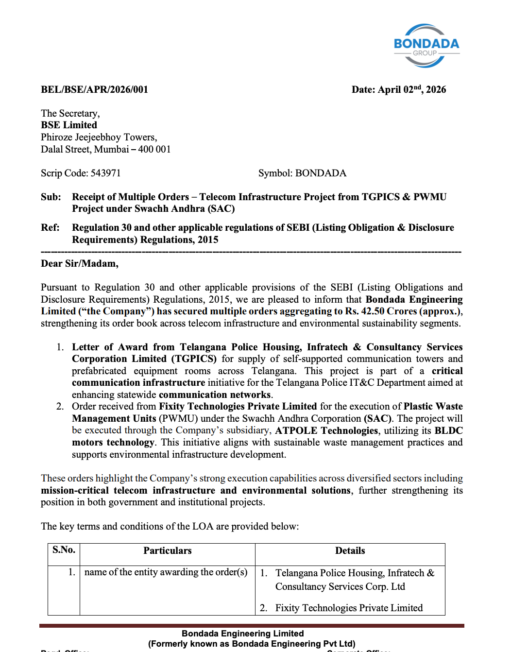 Official Exchange Filing: Bondada Engineering Limited