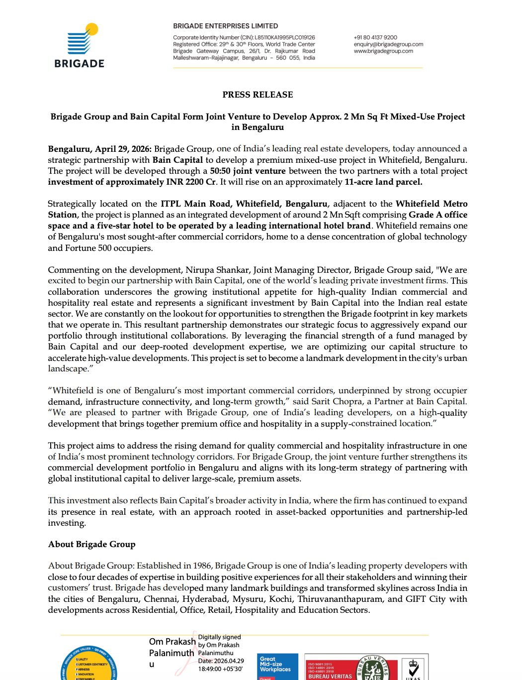 Brigade Enterprises Limited has entered into a 50:50 joint venture with Bain Capital to develop a ~2 million sq. ft. premium mixed-use project in Whitefield, Bengaluru, with a total investment of ~₹2,200 crore