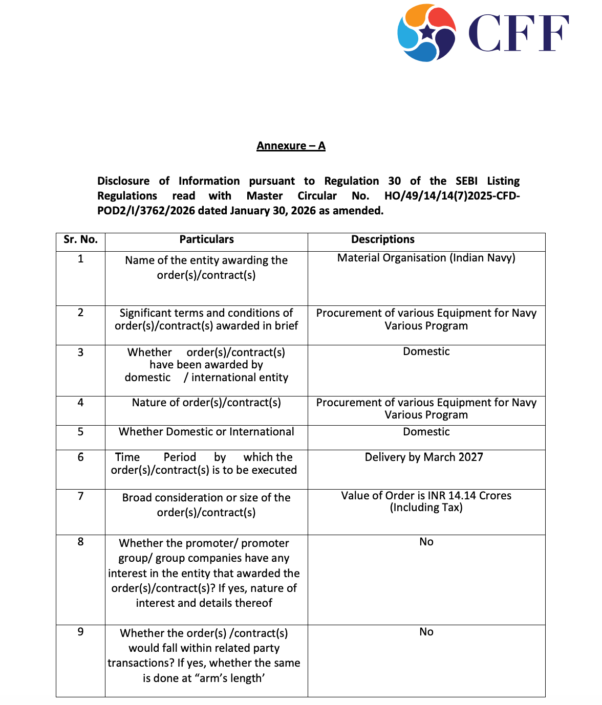 Official Exchange Filing: CFF Fluid Control Limited