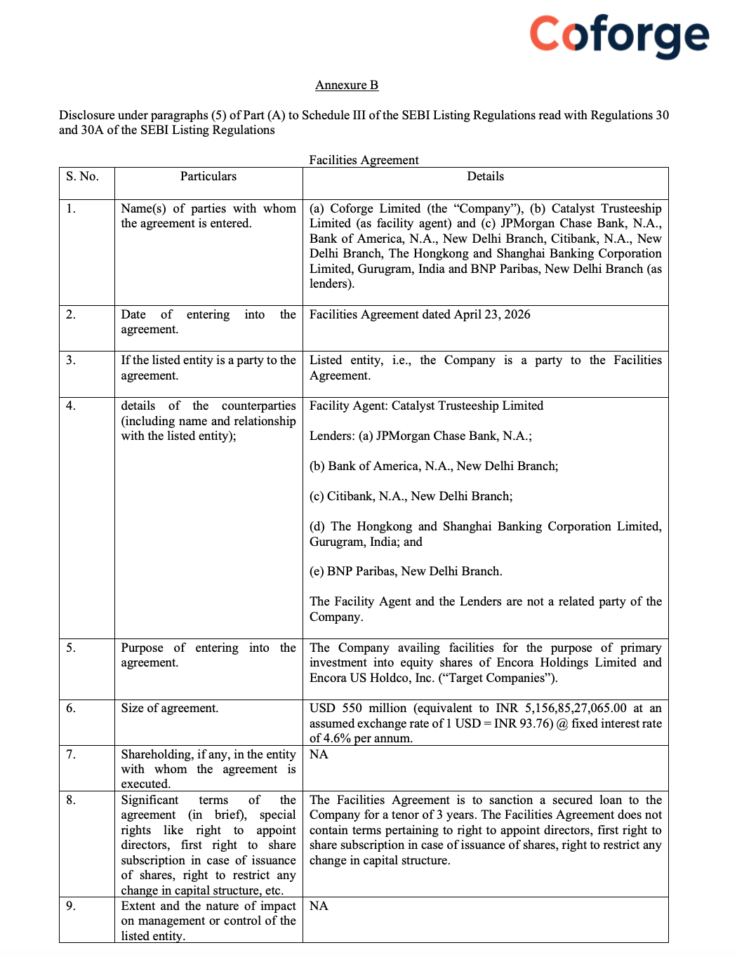 Official Exchange Filing: Coforge Limited