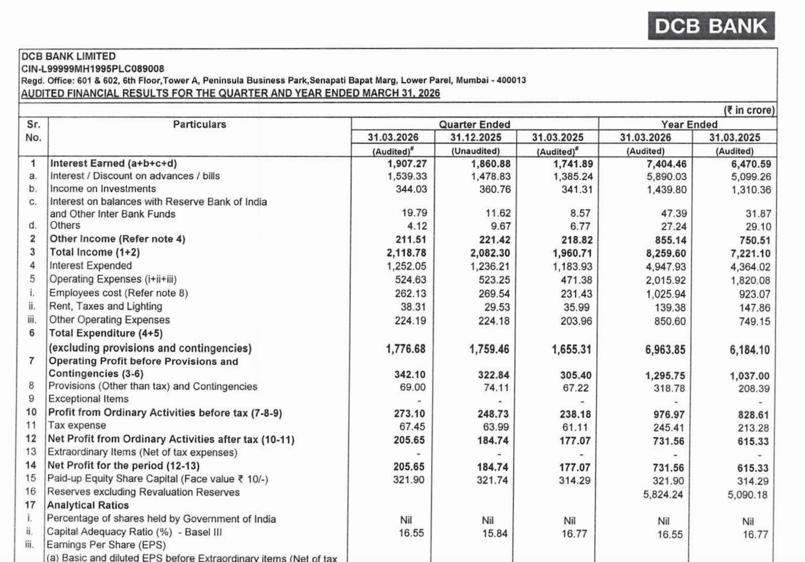 Official Exchange Filing: DCB Bank Ltd
