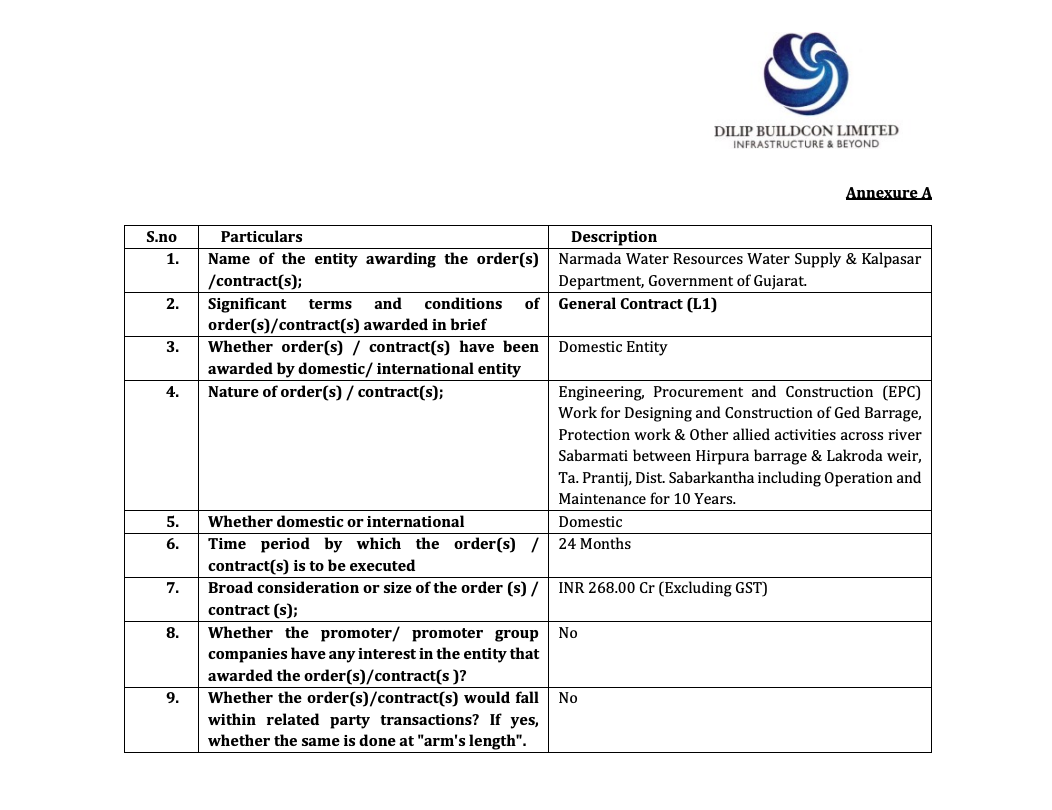 Dilip Buildcon Limited announced that it has been declared the L1 (lowest bidder) for a project floated by the Narmada Water Resources Water Supply & Kalpsar Department, Government of Gujarat.