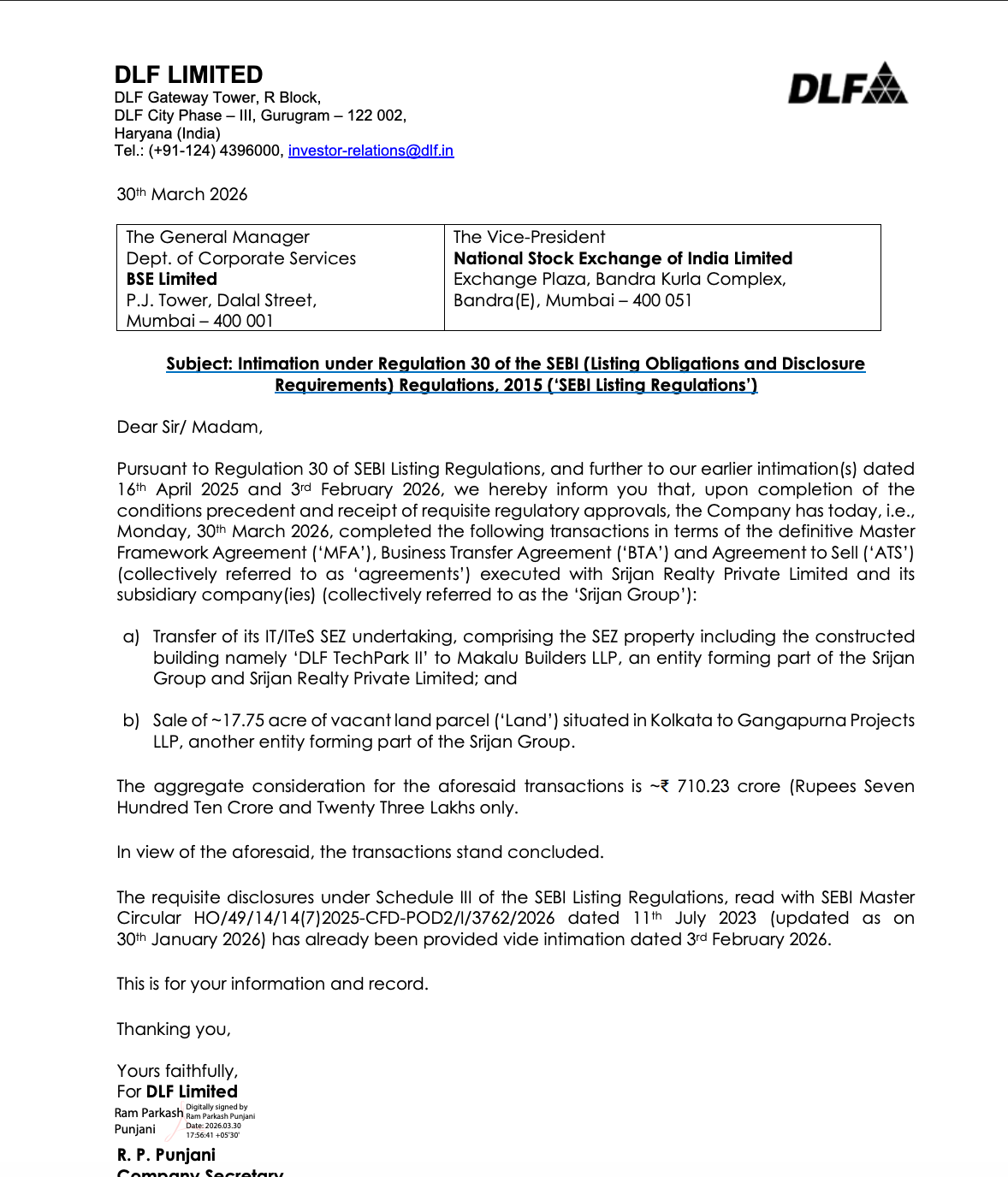 DLF Limited has completed asset monetization transactions worth ₹710.23 crore, including transfer of its IT/ITeS SEZ asset and sale of land parcel in Kolkata to entities of the Srijan Group. This move supports capital recycling and balance sheet optimization.