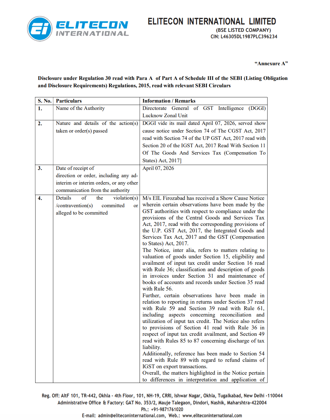 Elitecon International Limited announced that it has received a show cause notice from the Directorate General of GST Intelligence (DGGI), Lucknow Zonal Unit.