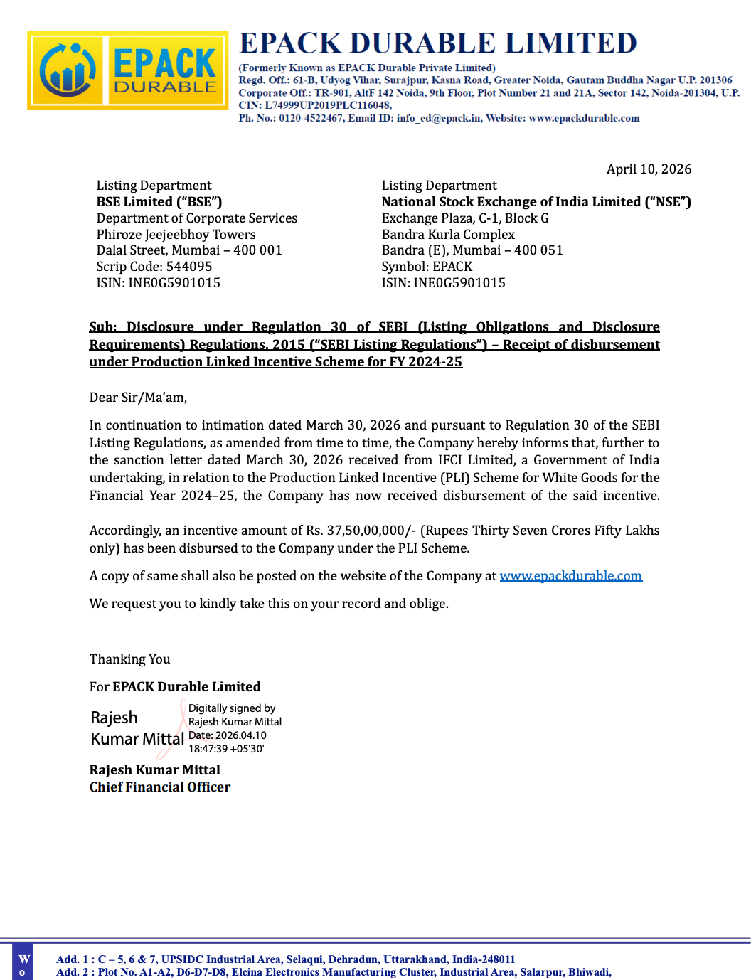 EPACK Durable Limited announced that it has received disbursement under the PLI scheme for white goods.