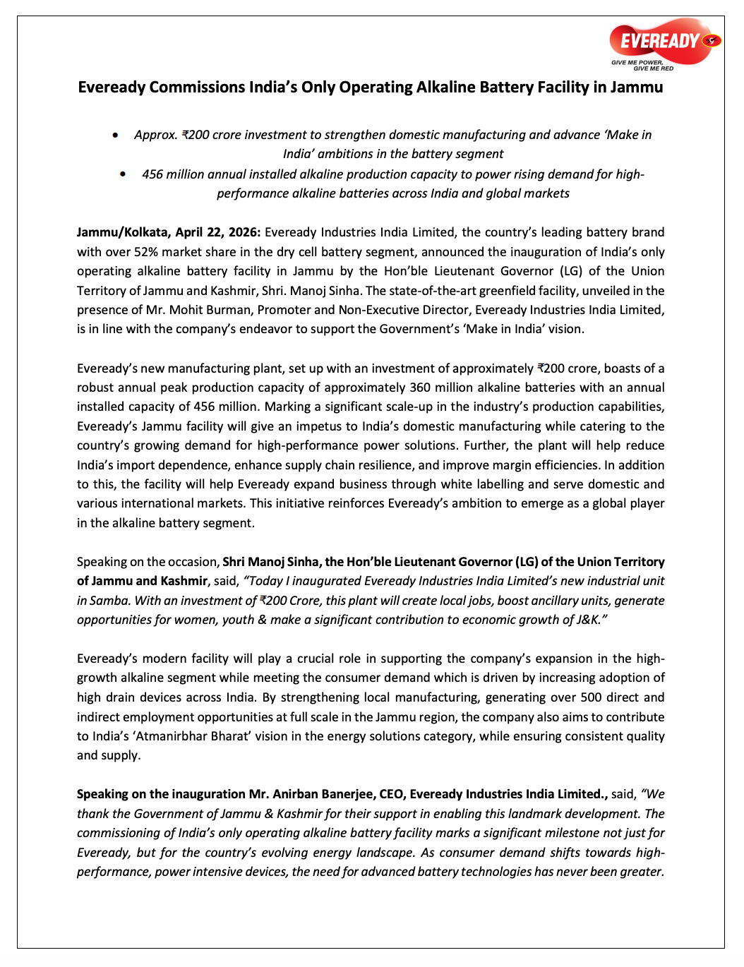 Eveready Industries India Limited has inaugurated and operationalised a new alkaline battery manufacturing facility in Jammu, marking a major milestone in domestic battery production and capacity expansion.