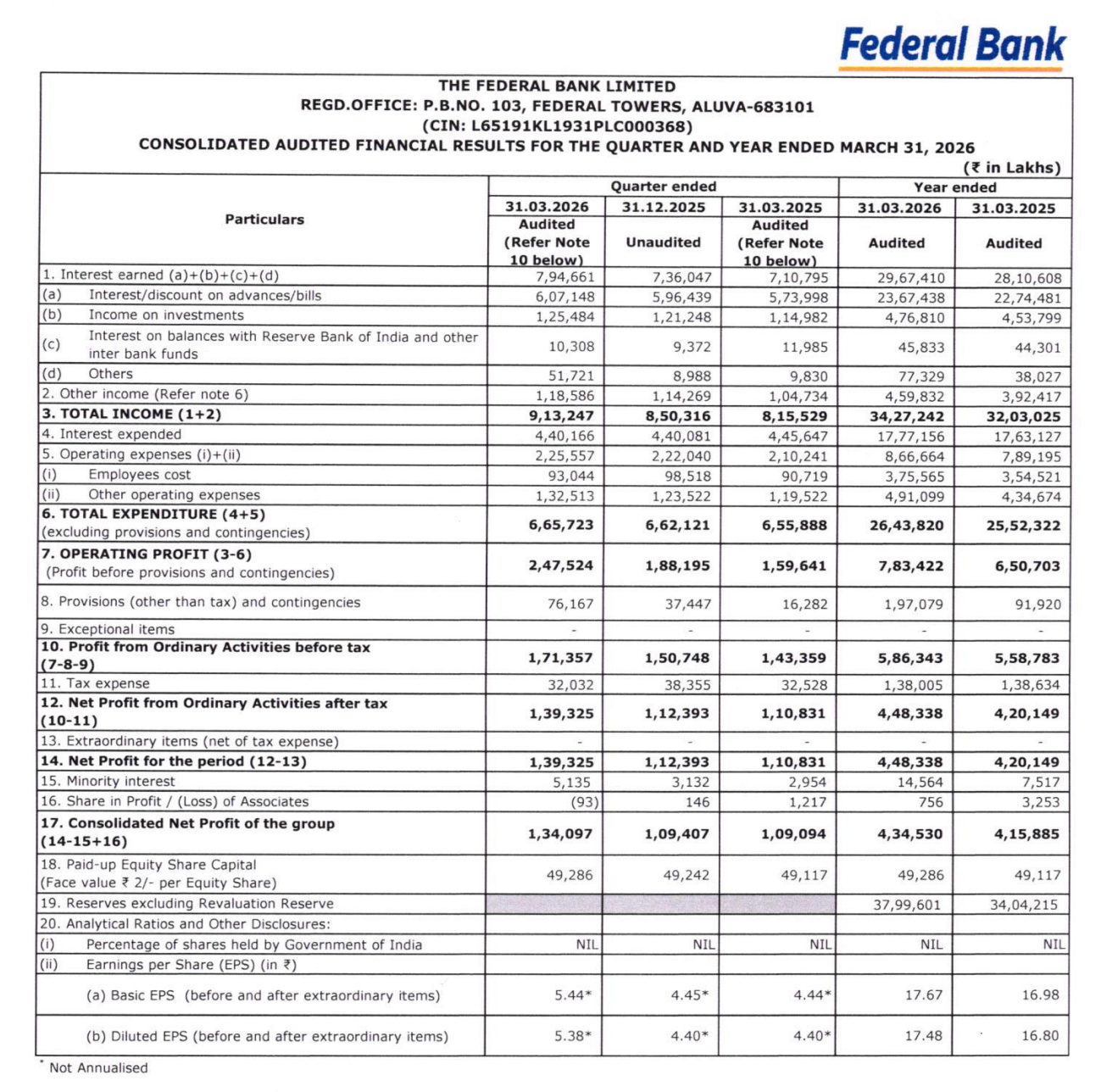 Federal Bank posted a strong operational quarter with: