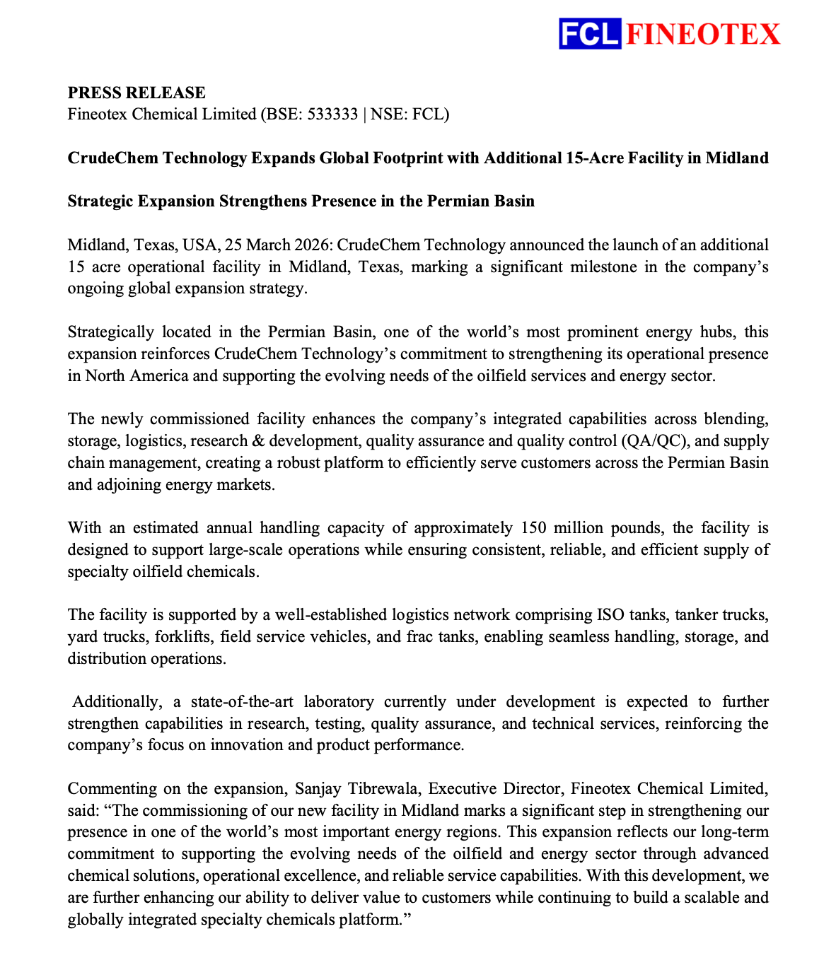 Fineotex Chemical Limited, through its subsidiary CrudeChem Technology, has announced the commissioning of an additional 15-acre operational facility in Midland, Texas, USA.