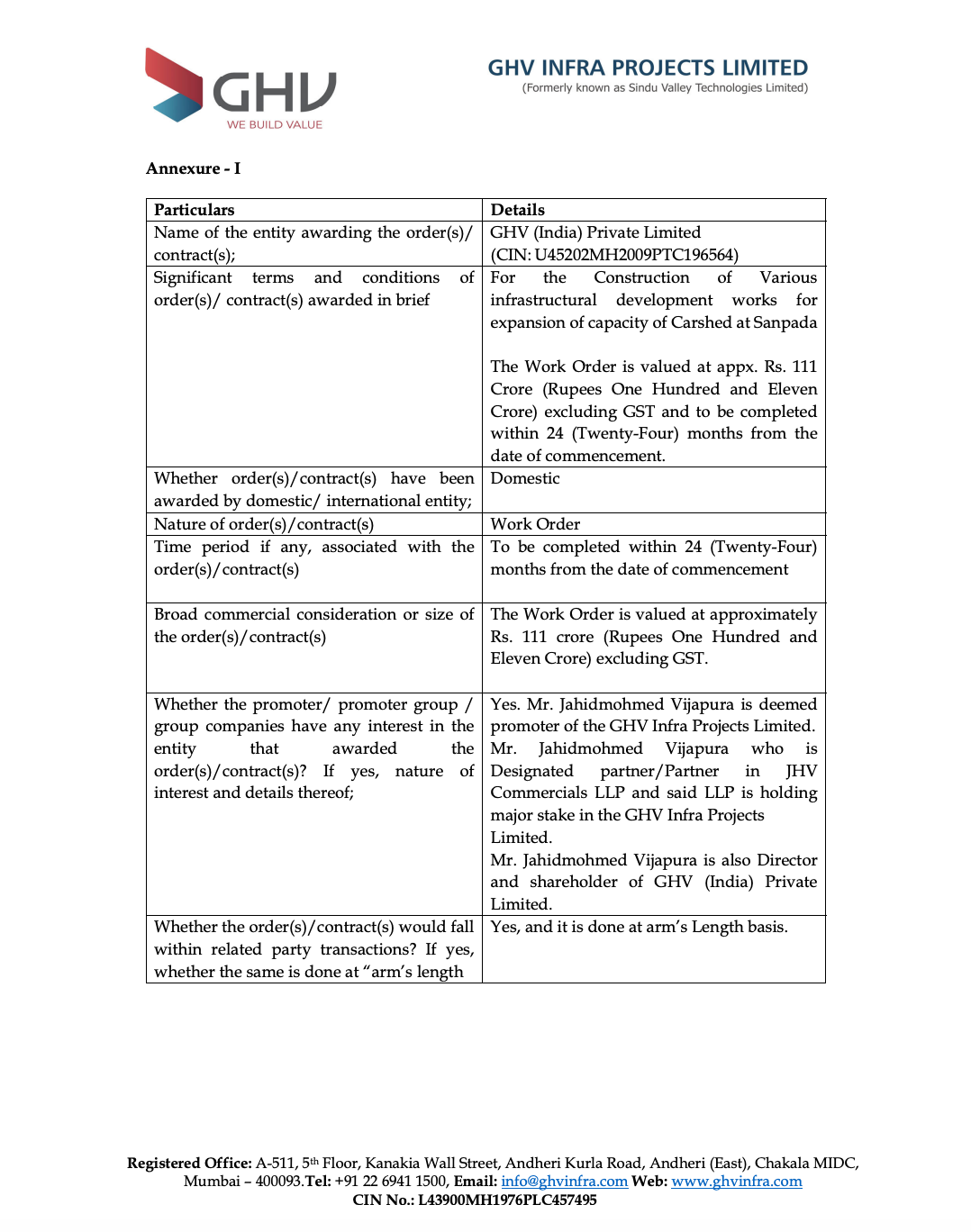 Official Exchange Filing: GHV Infra Projects Limited