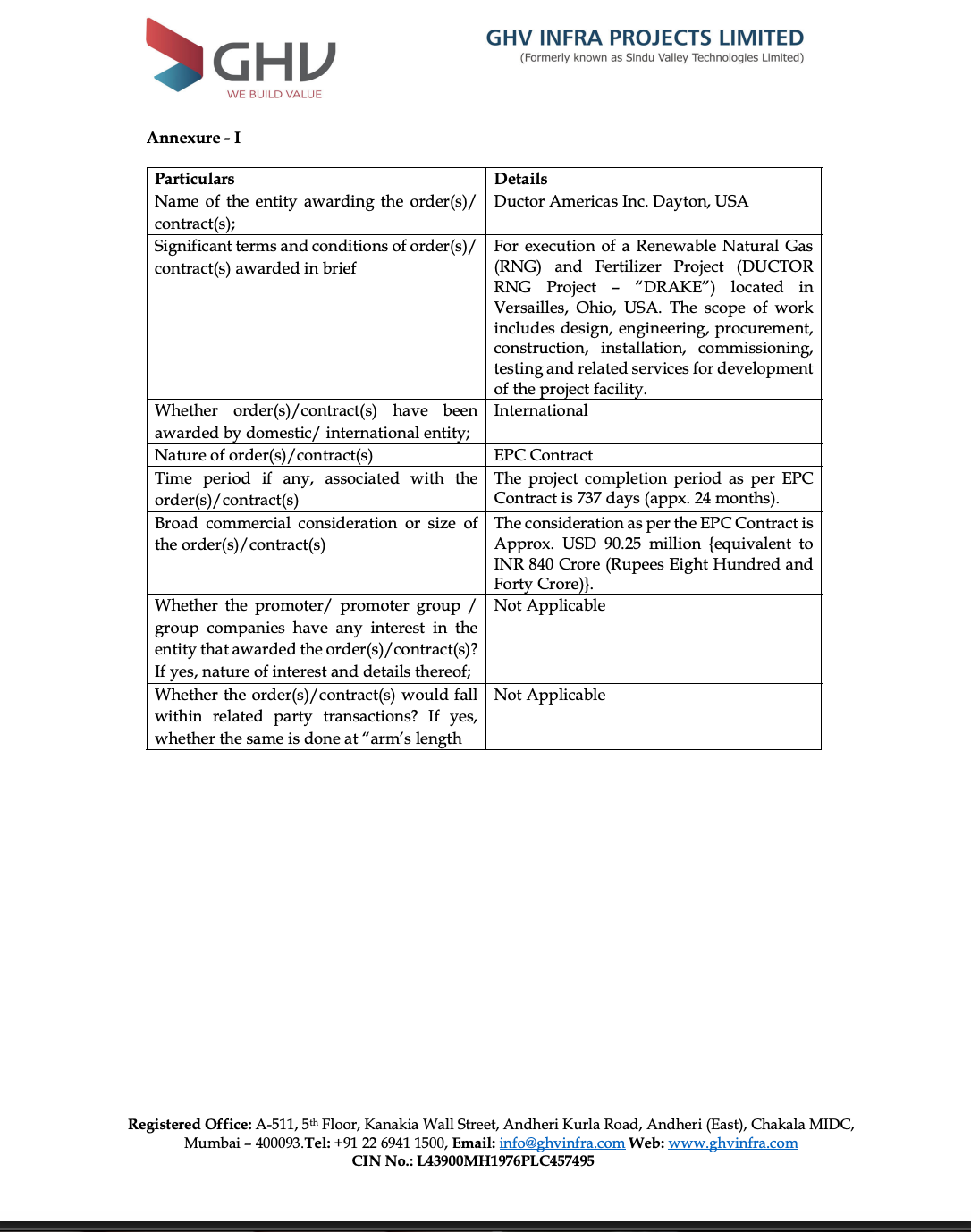 GHV Infra Projects Limited has secured an international EPC contract worth approximately ₹840 crore (USD 90.25 million) from Ductor Americas Inc. for a Renewable Natural Gas (RNG) and fertilizer project in Ohio, USA.