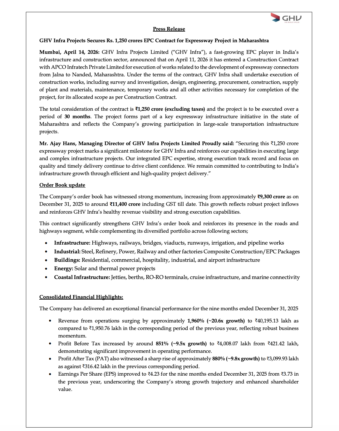 GHV Infra has entered into a construction contract for executing expressway connector works in Maharashtra.