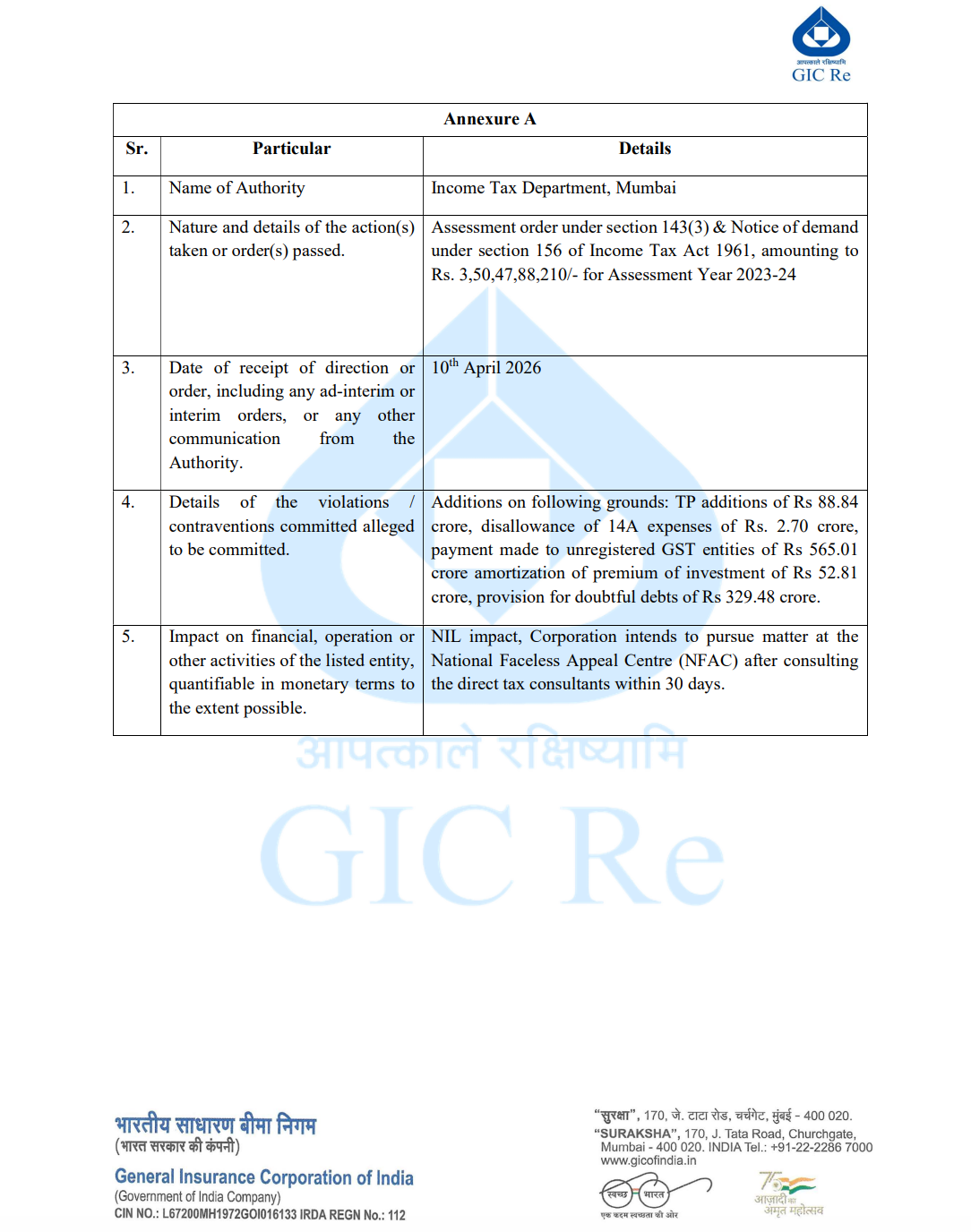 Official Exchange Filing: General Insurance Corporation of India