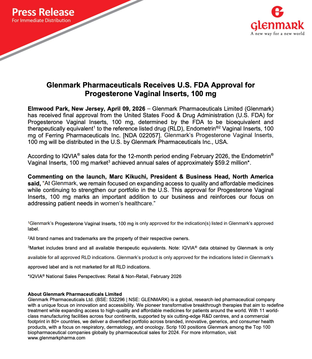 Glenmark has received final USFDA approval for Progesterone Vaginal Inserts (100 mg), targeting the U.S. market with a product equivalent to Endometrin®, with a market size of ~$59.2 million.