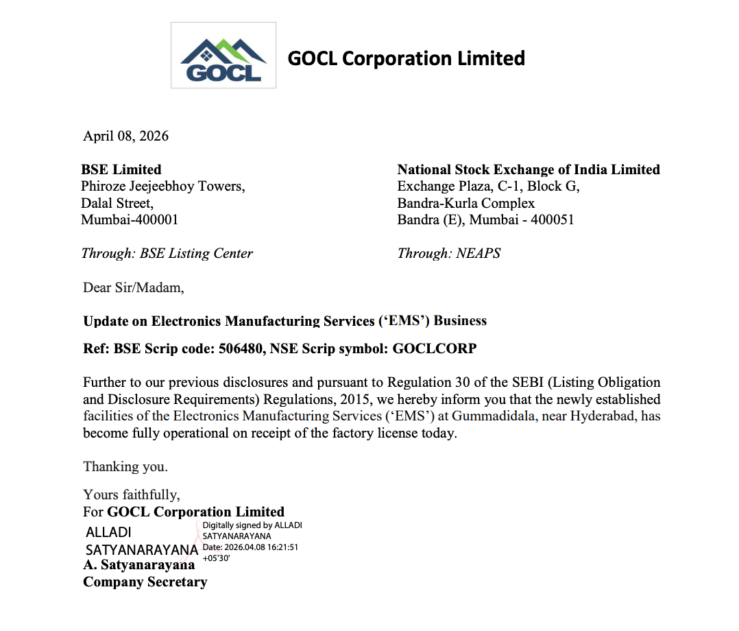 GOCL Corporation Limited announced that its Electronics Manufacturing Services (EMS) facility at Gummadidala, near Hyderabad, has become fully operational upon receiving the factory license.