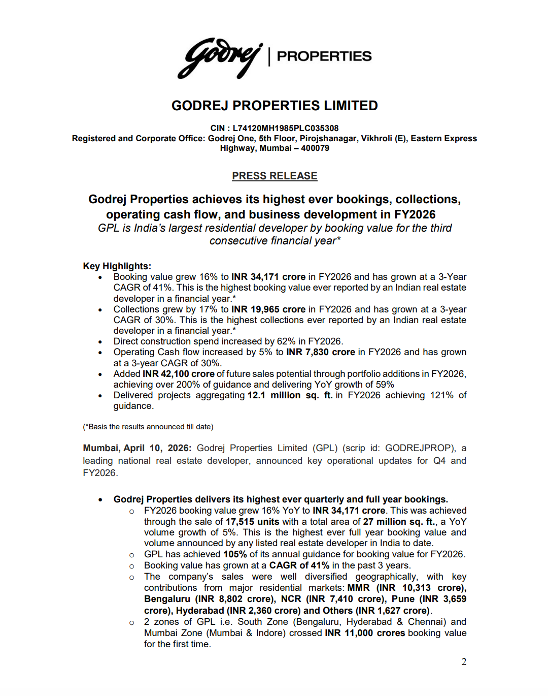 Godrej Properties Limited announced its FY2026 operational performance, highlighting record-breaking bookings, collections, and cash flow.