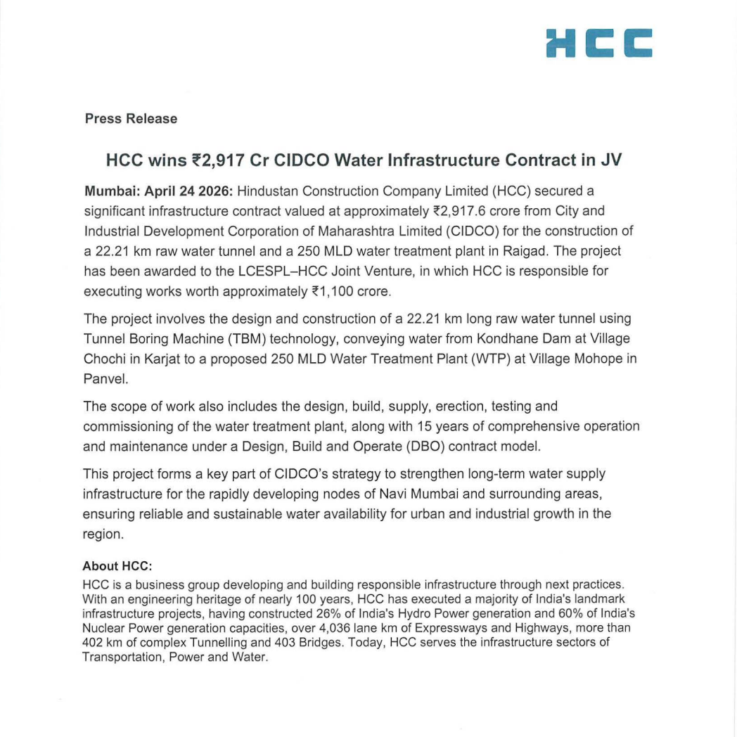 HCC, as part of a joint venture, has secured a major contract from CIDCO for constructing a water tunnel and treatment plant in Maharashtra, aimed at strengthening long-term water supply infrastructure.