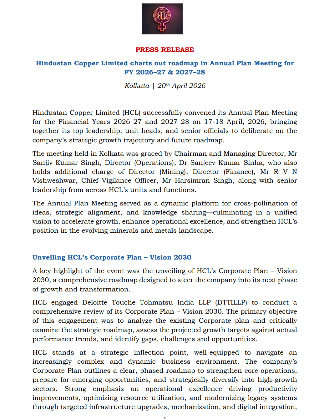 Hindustan Copper announced its Corporate Plan – Vision 2030 at its Annual Plan Meeting covering FY2026-27 and FY2027-28.