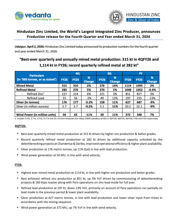 Hindustan Zinc Limited announced its production results for Q4FY26 and FY26, highlighting record annual mined metal output.