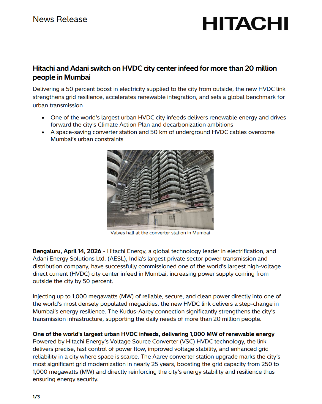 Hitachi Energy India, in collaboration with Adani Energy Solutions, has commissioned a 1,000 MW HVDC city center infeed project in Mumbai, increasing external power supply to the city by 50%. The project enhances grid resilience, supports renewable energy integration, and sets a benchmark for urban power infrastructure.
