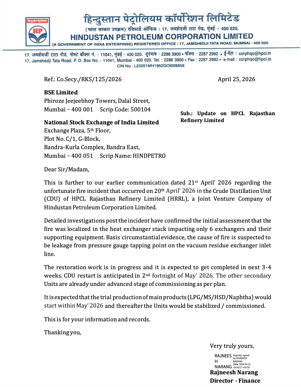 HPCL informed exchanges about developments following the fire incident on April 20, 2026 at the Crude Distillation Unit (CDU) of HPCL Rajasthan Refinery Limited (HRRL).