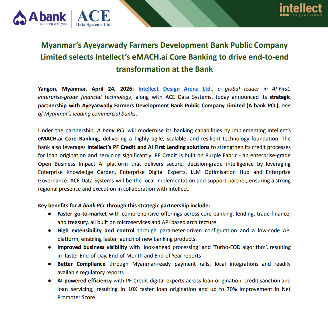 Intellect Design Arena has secured a strategic international deal with Myanmar-based Ayeyarwady Farmers Development Bank (A bank PCL) to implement its eMACH.ai core banking platform, marking a significant win in the global banking technology space.