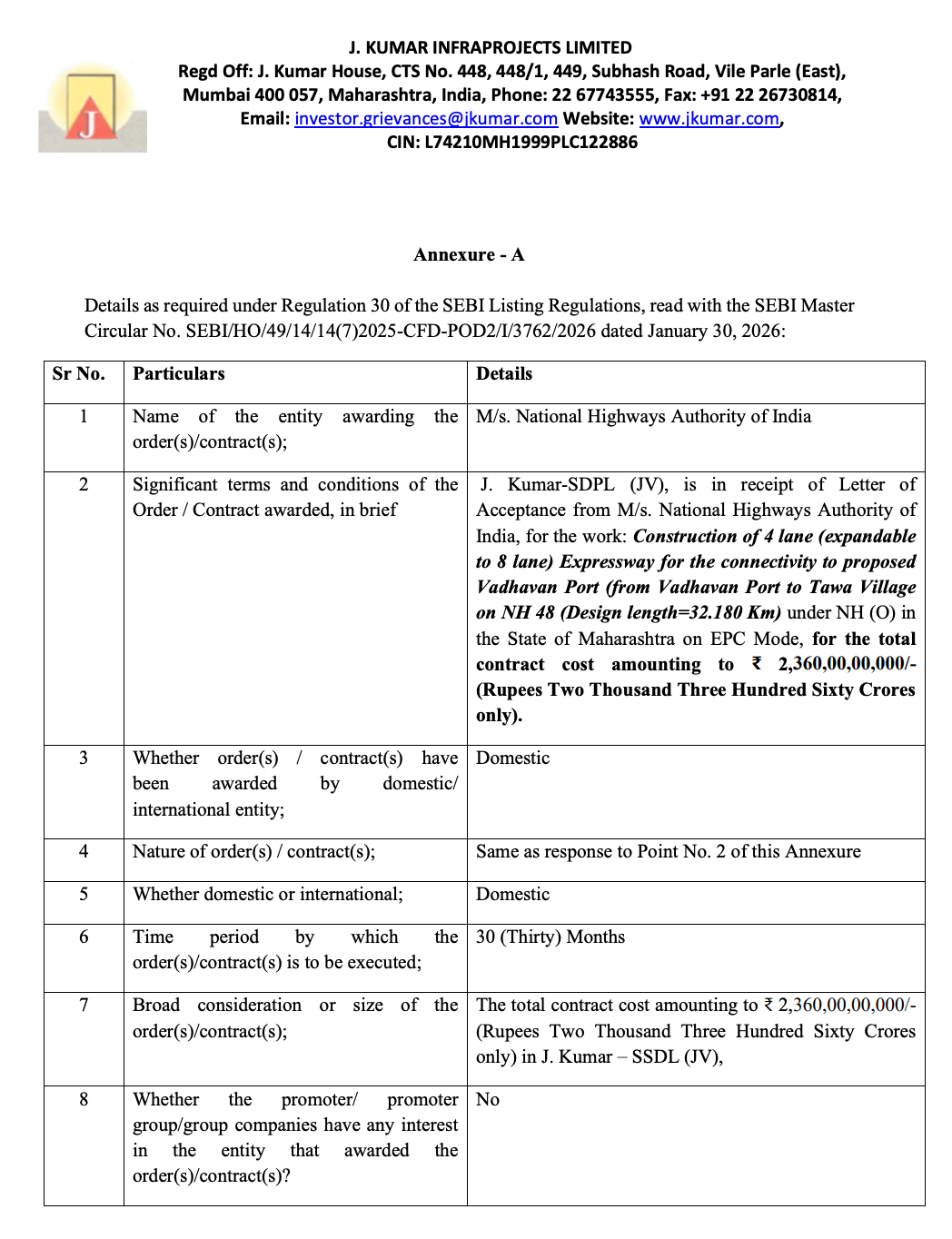 Official Exchange Filing: J. Kumar Infraprojects Limited