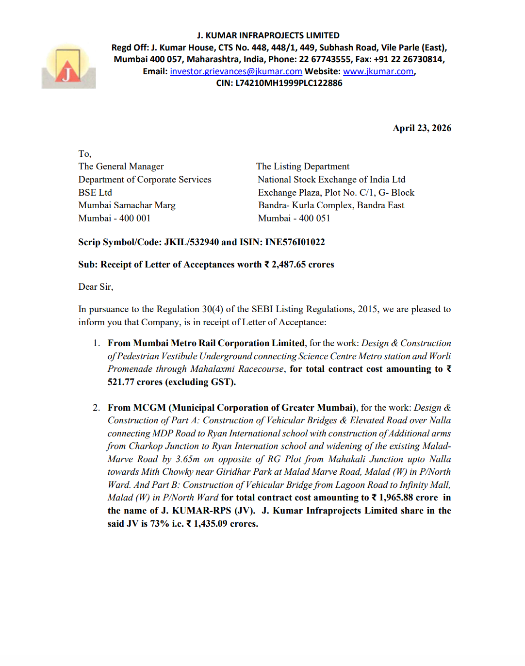 J. Kumar Infraprojects Limited has received Letters of Acceptance (LoAs) for projects worth ₹2,487.65 crore from Mumbai Metro Rail Corporation and MCGM, strengthening its infrastructure project pipeline
