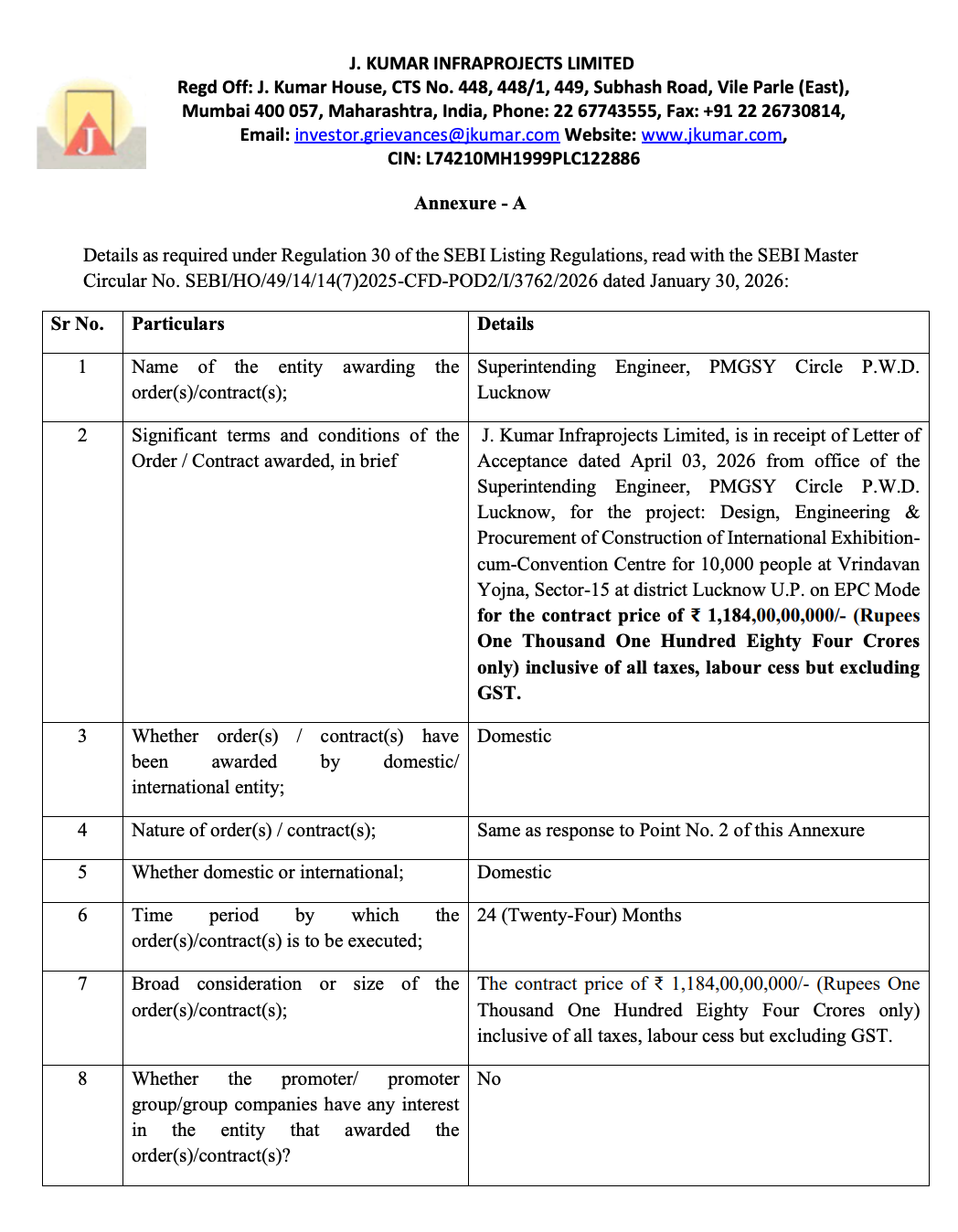 Official Exchange Filing: J. Kumar Infraprojects Limited