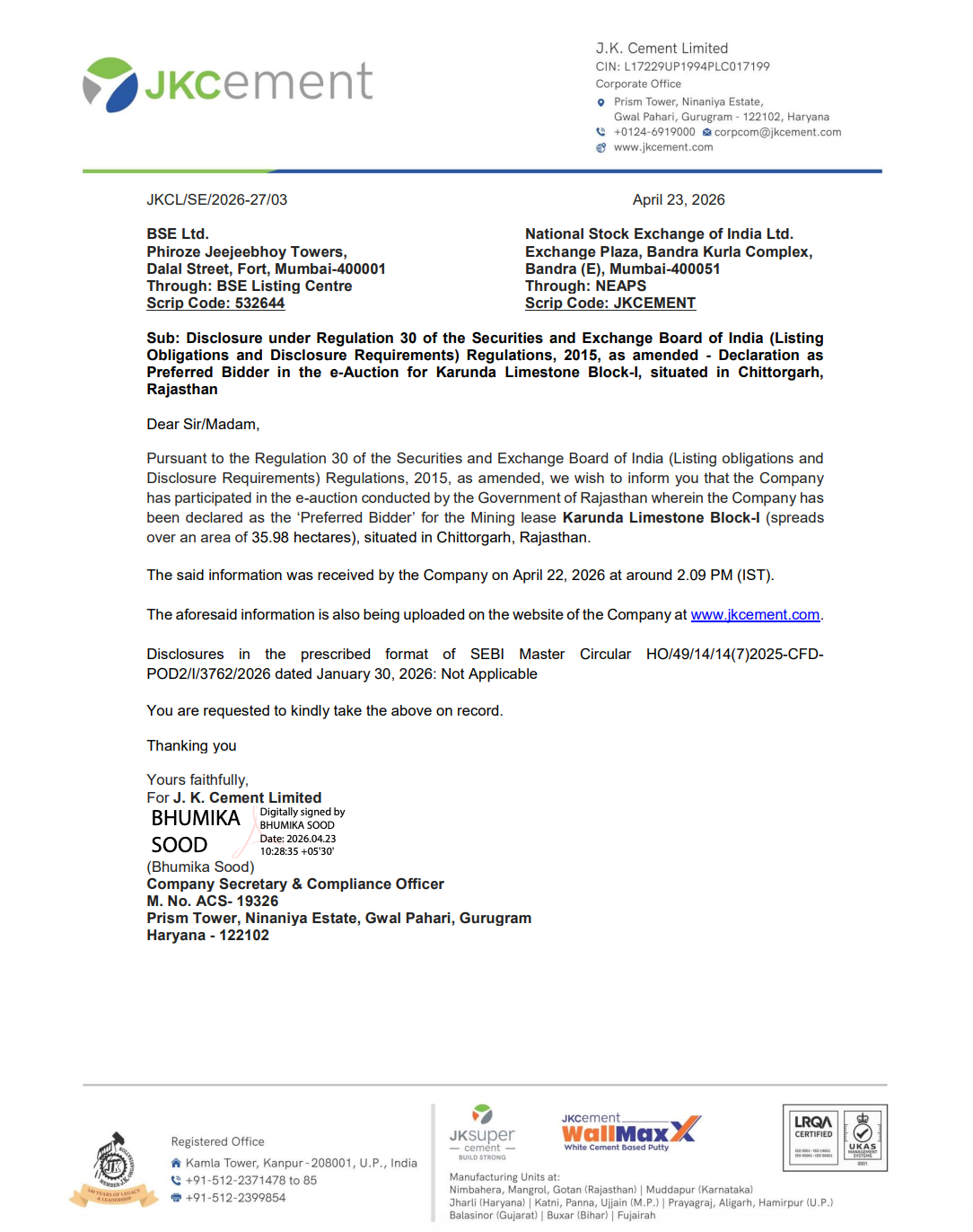 Official Exchange Filing: JK Cement Limited